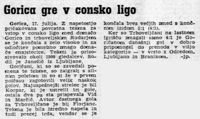 Leta 1955, ko Gorica sama sebe šteje kot slovenskega prvaka, so dejansko zmagali zahodno (drugo) ligo, tekme proti Rudarju pa niso bile tekme za prvaka, ampak kvalifikacije za slovensko-hrvaško ligo.