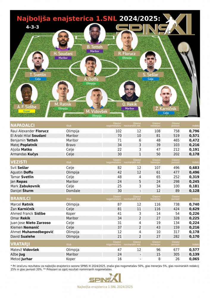 Foto: Urban Lesjak Deli na Facebook Deli na Twitter Deli na Google+ Deli na Reddit Deli na Pinterest Deli na Linkedin Znana je najboljša enajsterica nogometašev za sezono 2024/25. Imena je razkril Sindikat profesionalnih igralcev nogometa Slovenije (Spins), pri izboru pa so sodelovali igralci, trenerji, novinarji ter tudi navijači. Glasove je oddalo več kot 800 nogometašev in trenerjev 1. SNL, ter novinarjev športnih redakcij največjih medijskih hiš pri nas. Navijači so svoje glasove lahko oddali preko spletne strani Spins. Že jutri bo objavljeno ime najboljšega trenerja sezone in najboljšega mladega nogometaša, dan kasneje pa tudi ime najboljšega nogometaša za sezono 2024/25. Najboljša enajsterica sezone 2024/25 (4-3-3): Matevž Vidovšek (Olimpija) – Ahmed Sidibe (Koper) – Marcel Ratnik (Olimpija) – Omar Rekik (Maribor) – Žan Karničnik (Celje) – Tamar Svetlin (Celje) – Agustin Doffo (Olimpija – Svit Sešlar (Celje) – Hilal Soudani (Maribor) – Benjamin Tetteh (Maribor) – Raul Florucz (Olimpija) D.Š.